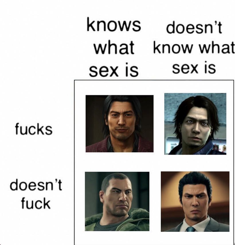 Kiryu’s consistent sexlessness is only enhanced by the fact that he’s literally surrounded by children – an orphanage full of them – as well as a daughter figure he has all but adopted as his own, and done it all without a partner. Somehow this man who both does not know what sex is and has also never had sex has become father to an ever-expanding roster of children. It’s the closest thing to a virgin birth one could do without a literal birth.